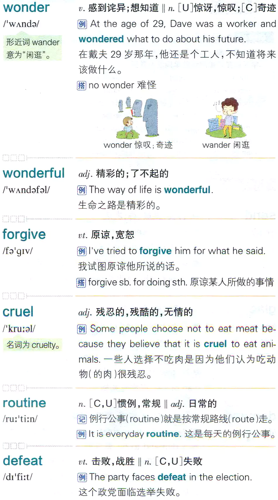 【第50页】wonder,wonderful,forgive,cruel,routine,defeat