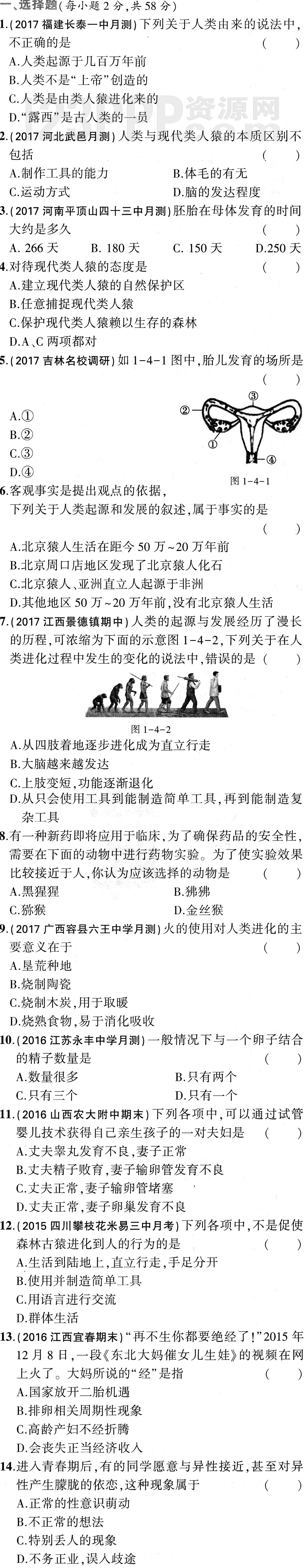 初中生物(人教版)七年级下册 【第1章检测】全练试题