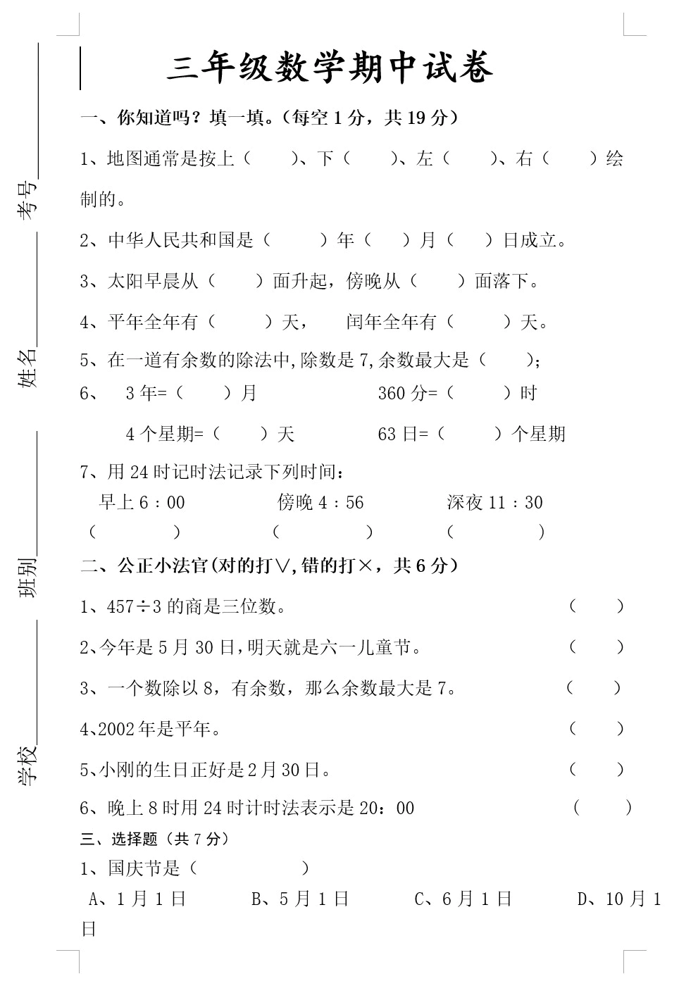人教新课标数学三年级下学期期中测试卷(含答案)(doc格式下载)【A01942】