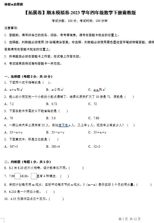 【拓展卷】期末模拟卷-2023学年四年级数学下册(冀教版,含答案)【A01526】